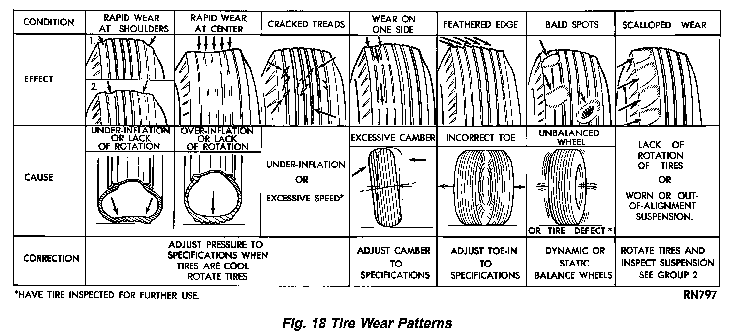 Excessive camber causes the tire to run at an angle to the road. One side of tread is then worn more than the other (Fig. 18).