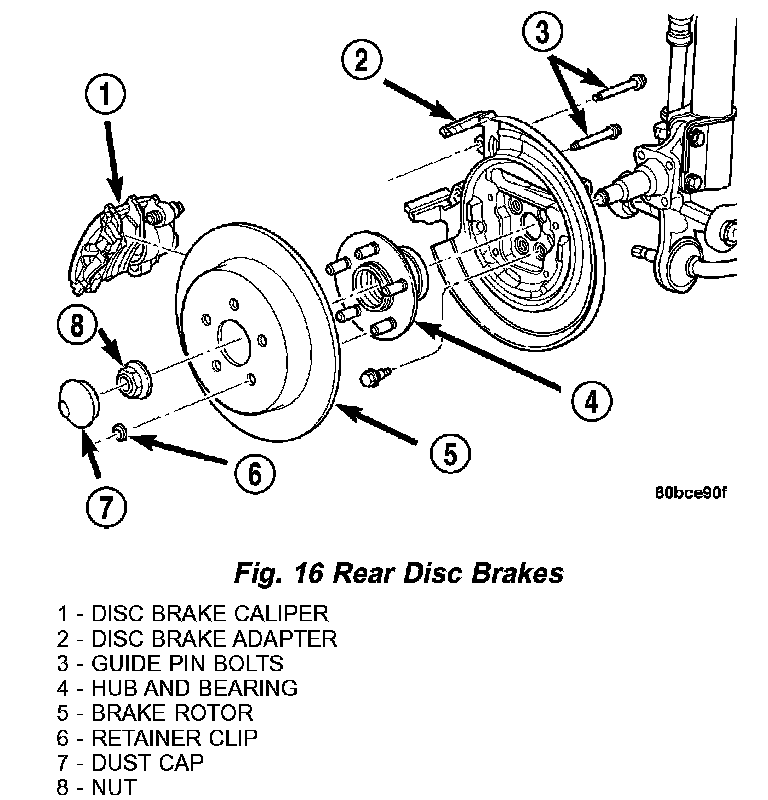 3. If the vehicle is equipped with rear disc brakes (Fig. 16), install the brake rotor and disc brake caliper on the knuckle. Install the two guide pin bolts securing the front disc brake caliper to the steering knuckle. Tighten the guide pin bolts to a torque of 22 Nm (192 inch lbs.).
