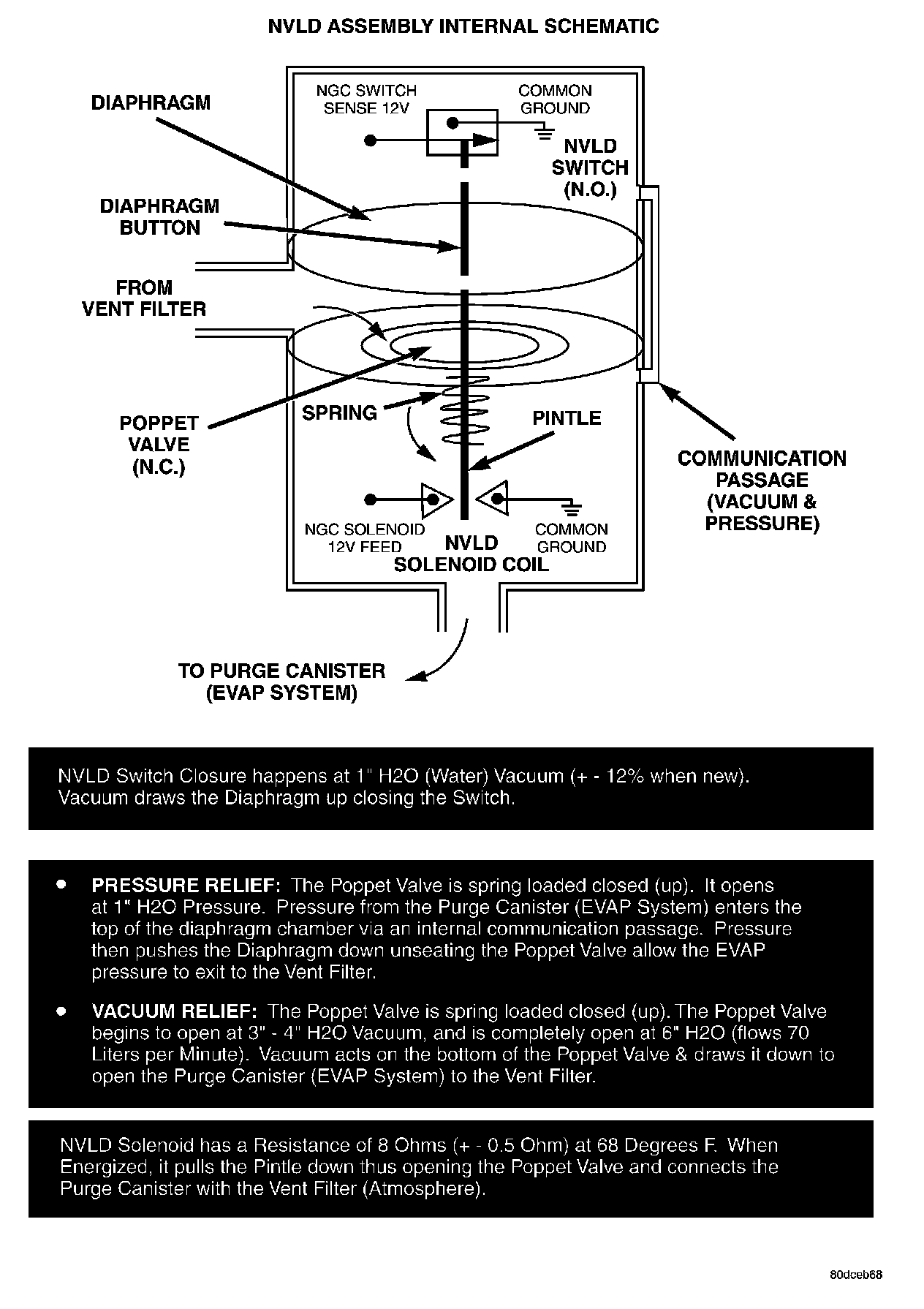 The normally closed valve in the NVLD is intended to maintain the seal on the evaporative system during the engine off condition. If vacuum in the evaporative system exceeds 3 inches to 6 inches H2O (0.75 to 1.5 KPA), the valve will be pulled off the seat, opening the seal. This will protect the system from excessive vacuum as well as allowing sufficient purge flow in the event that the solenoid was to become inoperative. The solenoid actuates the valve to unseal the canister vent while the engine is running. It also will be used to close the vent during the medium and large leak tests and during the purge flow check. This solenoid requires initial 1.5 amps of current to pull the valve open but after 100 ms. will be duty cycled down to an average of about 150 mA for the remainder of the drive cycle.
