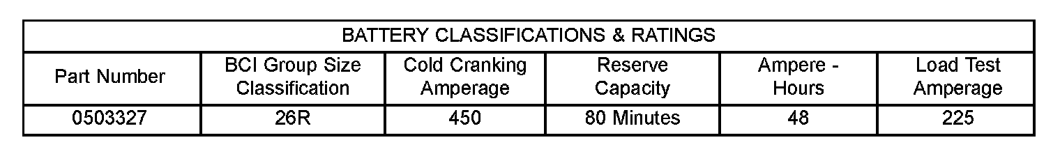 The battery Group Size number, the Cold Cranking Amperage (CCA) rating, and the Reserve Capacity (RC) rating or Ampere-Hours (AH) rating can be found on the original equipment battery label. Be certain that a replacement battery has the correct Group Size number, as well as CCA, and RC or AH ratings that equal or exceed the original equipment specification for the vehicle being serviced. Battery sizes and ratings are discussed in more detail below.- Group Size - The outside dimensions and terminal placement of the battery conform to standards established by the Battery Council International (BCI). Each battery is assigned a BCI Group Size number to help identify a correctly-sized replacement.