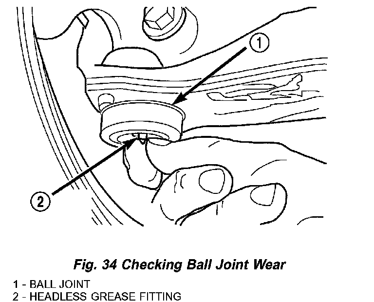 With the weight of the vehicle resting on the road wheels, grasp the headless grease fitting as shown (Fig. 34). With no mechanical assistance or added force, attempt to move the grease fitting. If the ball joint is worn, the grease fitting will move. If movement is noted, replace the ball joint.
