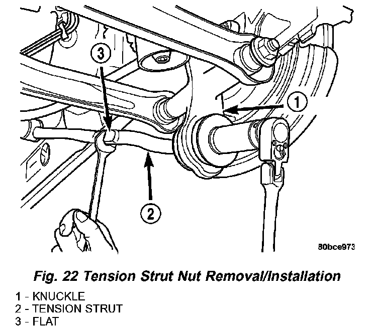 6. Install the rear tension strut retainer, then the nut. To completely install the nut, place a wrench on the flat formed into the tension strut and tighten the nut (Fig. 22). Tighten the nut to a torque of 95 Nm (70 ft. lbs.).