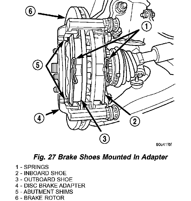 5. Remove the brake shoes from the disc brake caliper adapter (Fig. 27).