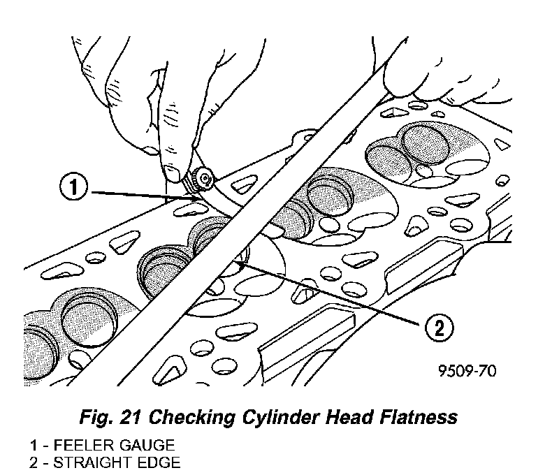 1. Cylinder head must be flat within 0.1 mm (0.004 inch) (Fig. 21).