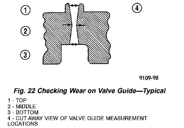 4. Using a small hole gauge and a micrometer, measure valve guides in 3 places top, middle and bottom (Fig. 22). Replace guides if they are not within specification.
