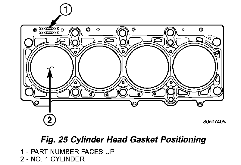 1. Position the new cylinder head gasket on engine block with the part number facing up (Fig. 25). Ensure gasket is seated over the locating dowels in block.