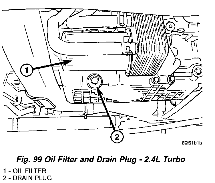 6. Remove oil pan drain plug (Fig. 99) and allow oil to drain into collecting container. Inspect drain plug threads for stretching or other damage. Replace drain plug and gasket if damaged.