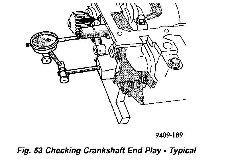 4. Move crankshaft all the way to the front of its travel and read the dial indicator. For crankshaft specifications (Refer to - ENGINE - SPECIFICATIONS)