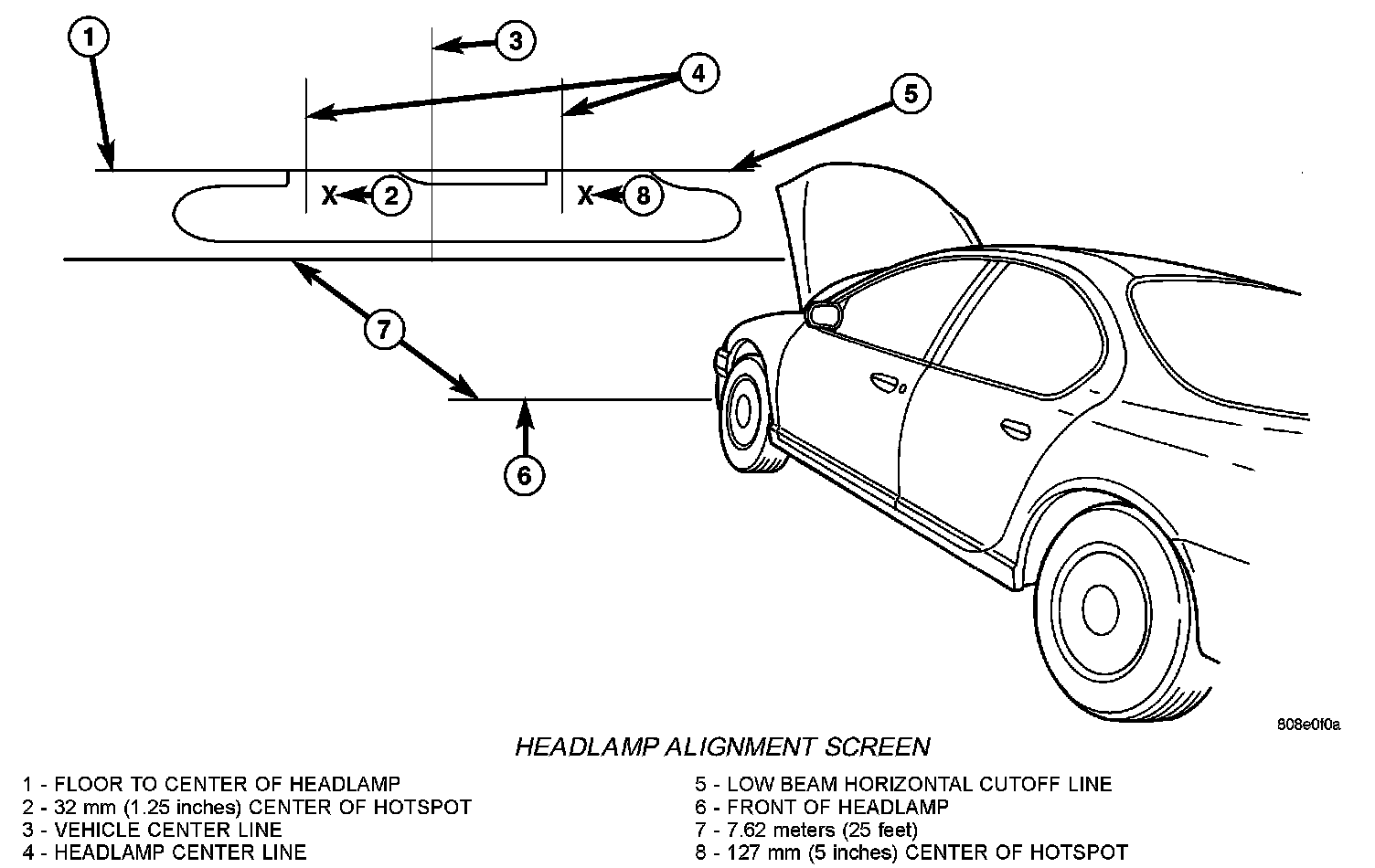 The PL headlamp low beam pattern has a distinct horizontal cutoff line which is used to visually align the headlamps. A properly aimed headlamp will have the horizontal cutoff line of the low beam pattern centered on the low beam pattern centered on the horizontal center of headlamp line. The side to side left edge of the low beam hot spot should be located 75 mm (3 inches) to the left of the headlamp center line. The high beams on a vehicle with aero headlamps cannot be aligned. The high beam pattern should be correct when the low beams are aligned properly.