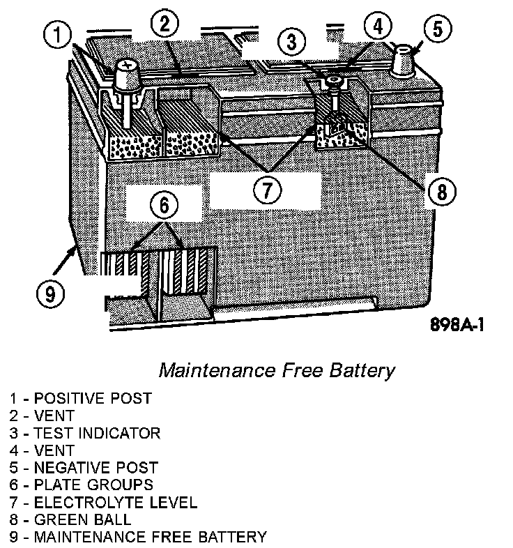 Maintenance-free batteries have non-removable battery vent caps. Water cannot be added to this battery. Under normal service the composition of this battery reduces gassing and water loss at normal charge rates. If the battery electrolyte level becomes low, this battery must be replaced.