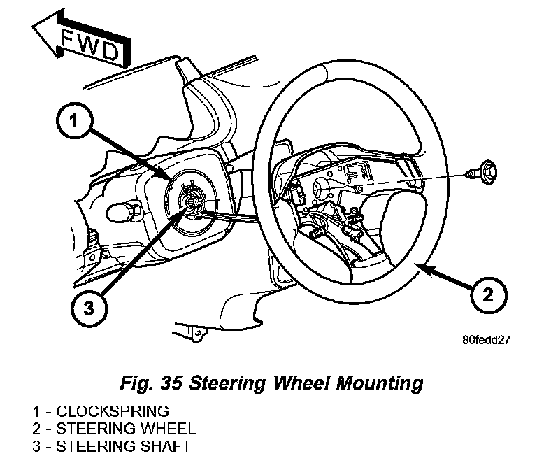 4. Install the steering wheel retaining screw and tighten it until the steering wheel is fully installed on shaft (Fig. 35). Tighten the retaining screw to a torque of 54.2 Nm (40 ft. lbs.).