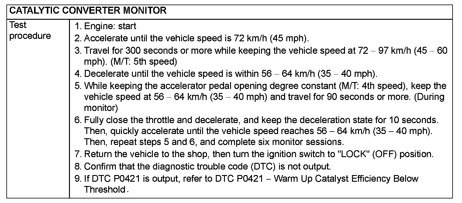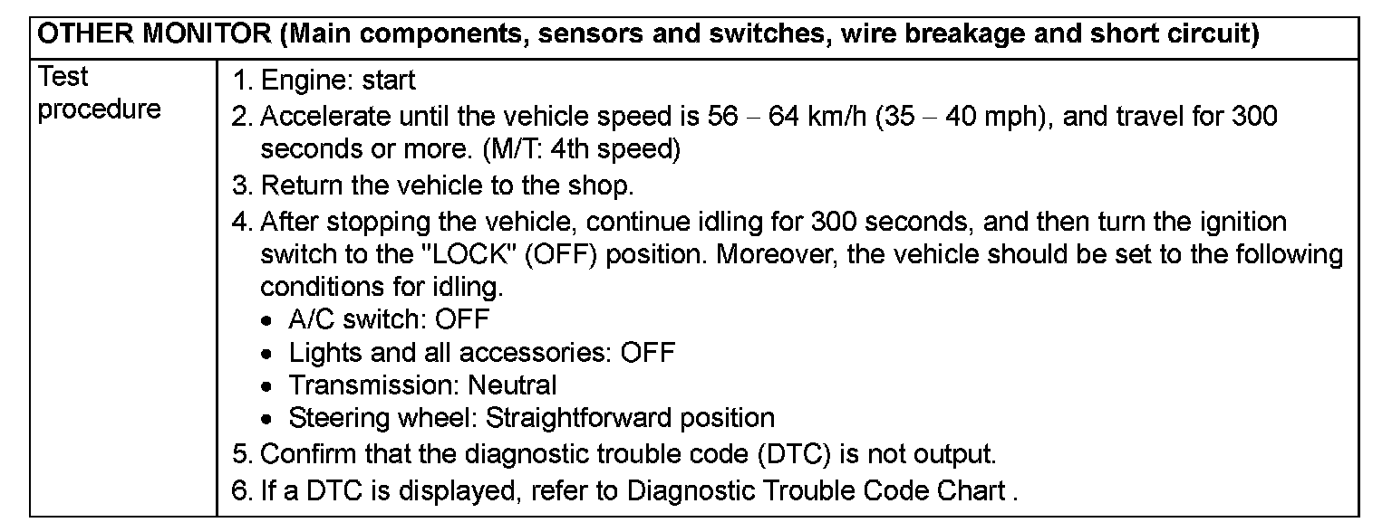All kinds of diagnostic trouble codes (DTCs) can be monitored by carrying out a short drive according to the following six drive cycle pattern. In other words, doing such a drive regenerates any kind of trouble which involves illuminating the Malfunction Indicator Lamp (SERVICE ENGINE SOON) and verifies the repair procedure has eliminated the trouble (the Malfunction Indicator Lamp (SERVICE ENGINE SOON) is no longer illuminated).CAUTION: Two technicians should always be in the vehicle when carrying out a test drive.