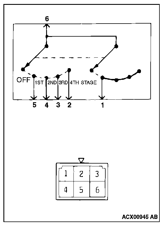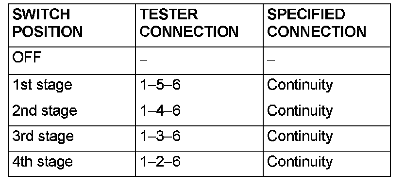 This figure illustrates a complex switch. The continuity between terminals at each position is as indicated in the table below.