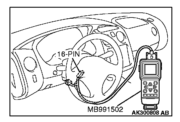 CAUTION: To prevent damage to scan tool MB991502, always turn the ignition switch to the "LOCK" (OFF) position before connecting or disconnecting scan tool MB991502.