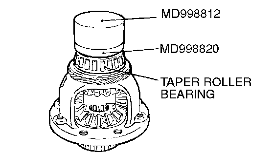 Using special tools MD998812 and MD998820, press in the taper roller bearing with the press.