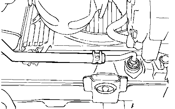 1. Disconnect the hose shown in the illustration which connects the transaxle and the oil cooler (inside the radiator). Place a container under the hose to collect the discharge.