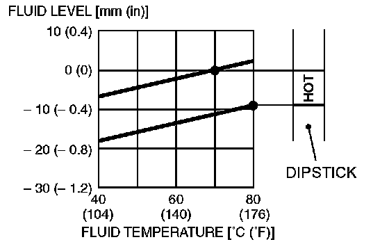 12. Drive the vehicle until the transmission fluid temperature rises to the normal operating temperature [70 - 80°C (158 - 176°F)], and then check the transmission fluid level again. The transmission fluid level must be at the "HOT" mark.