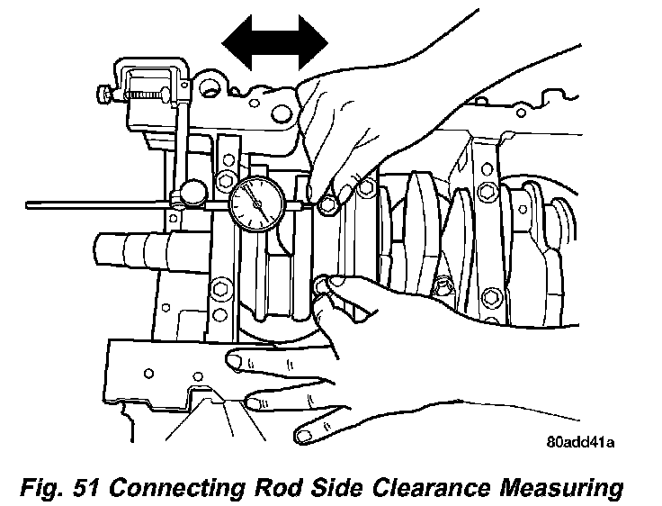 1. Mount a dial indicator to a stationary point on engine. Locate probe perpendicular to and resting against the connecting rod cap being checked. Move connecting rod all the way to rear of its travel. Zero the dial indicator. Move connecting rod forward to limit of travel and read the dial indicator (Fig. 51).