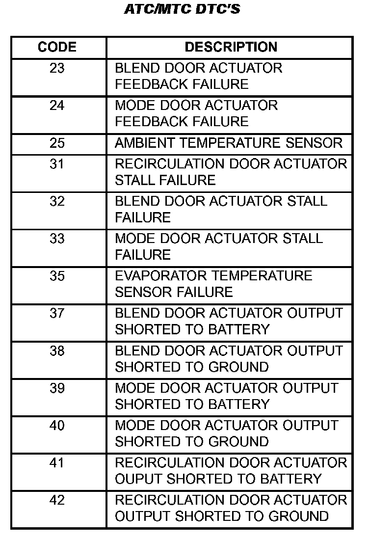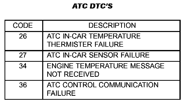There are three DTC tables shown. These DTC tables are to be used when diagnosing the ATC and MTC system using only the vehicles diagnostic display. The DTC's cover operation of the climate control door actuators, ambient temperature sensor, in-car temperature sensor, and the A/C-heater control head. The ATC/MTC DTC table contains faults that are common to both the ATC and the MTC systems. The ATC DTC table covers DTC's that only pertain to only the ATC system and the MTC DTC table has DTC's that pertain to only the MTC system.