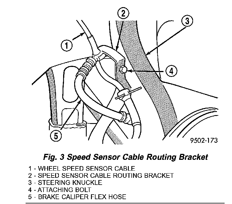 5. If equipped with antilock brakes, remove bolt securing wheel speed sensor cable routing bracket to steering knuckle (Fig. 3).