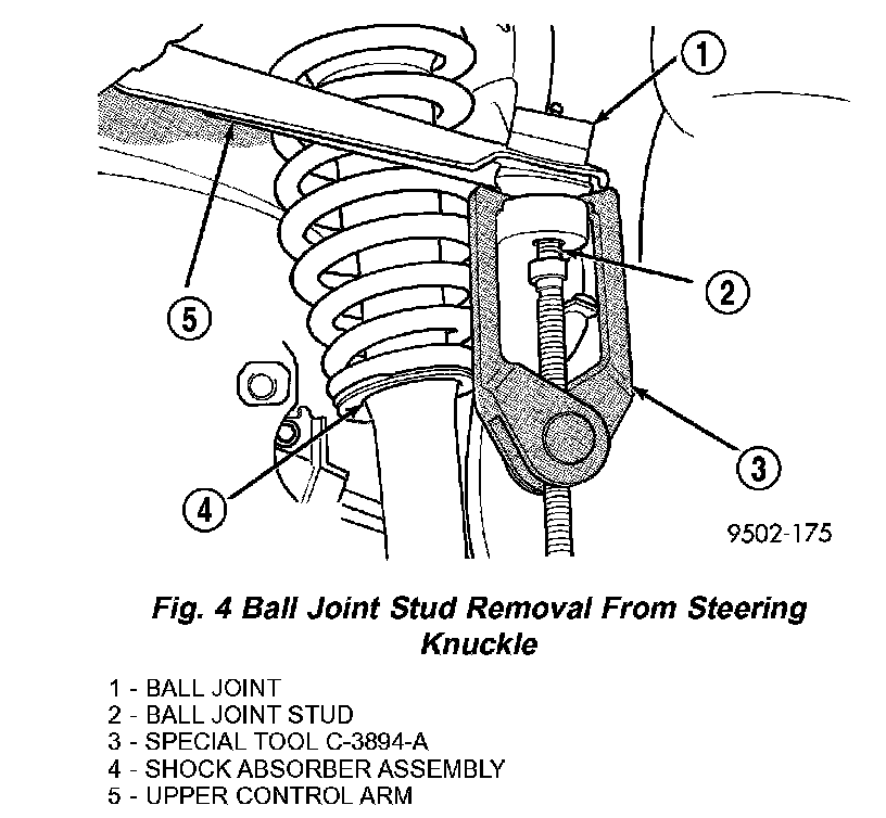 7. Remove upper ball joint stud from steering knuckle using Puller, Special Tool, C-3894-A (Fig. 4).