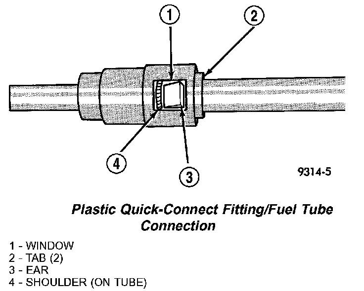 4. The plastic quick-connect fitting has windows in the sides of the casing. When the fitting completely attaches to the fuel tube, the retainer locking ears and the fuel tube shoulder are visible in the windows. If they are not visible, the retainer was not properly installed. Do not rely upon the audible click to confirm a secure connection.