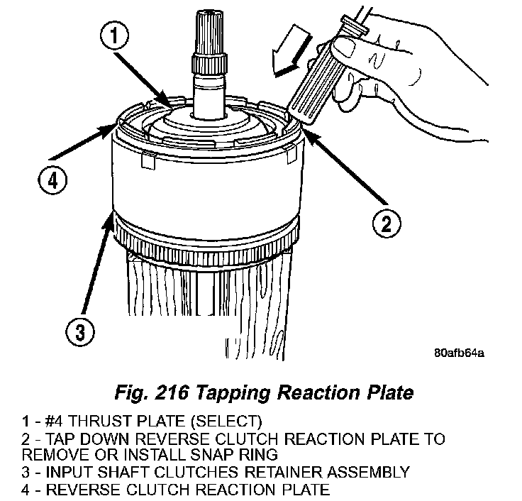 2. Tap down reverse clutch reaction plate to release pressure from snap ring (Fig. 216).