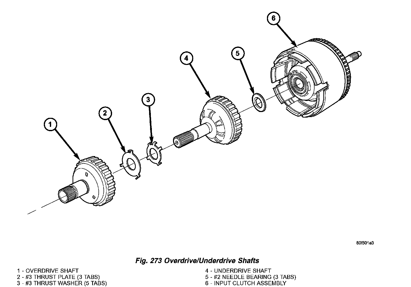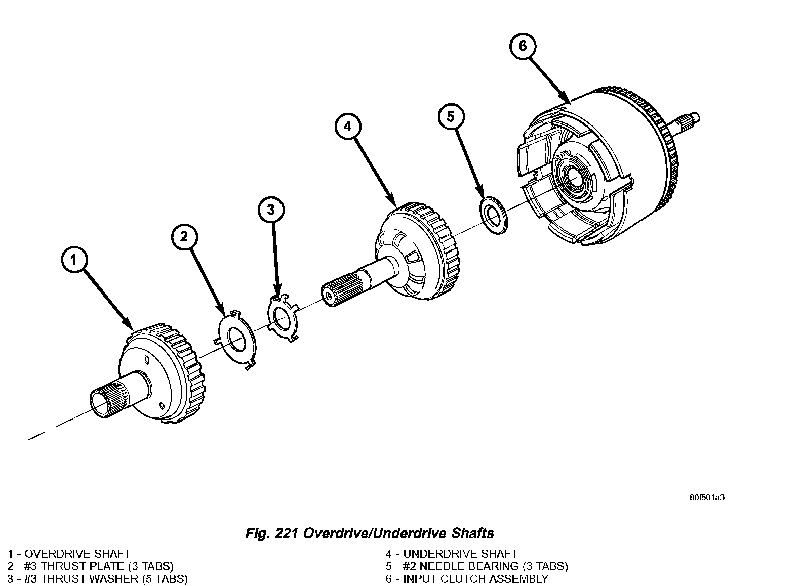 10. Remove and inspect OD and UD Shafts, as well as #3 thrust washer and plate, and #2 needle bearing (Fig. 221).