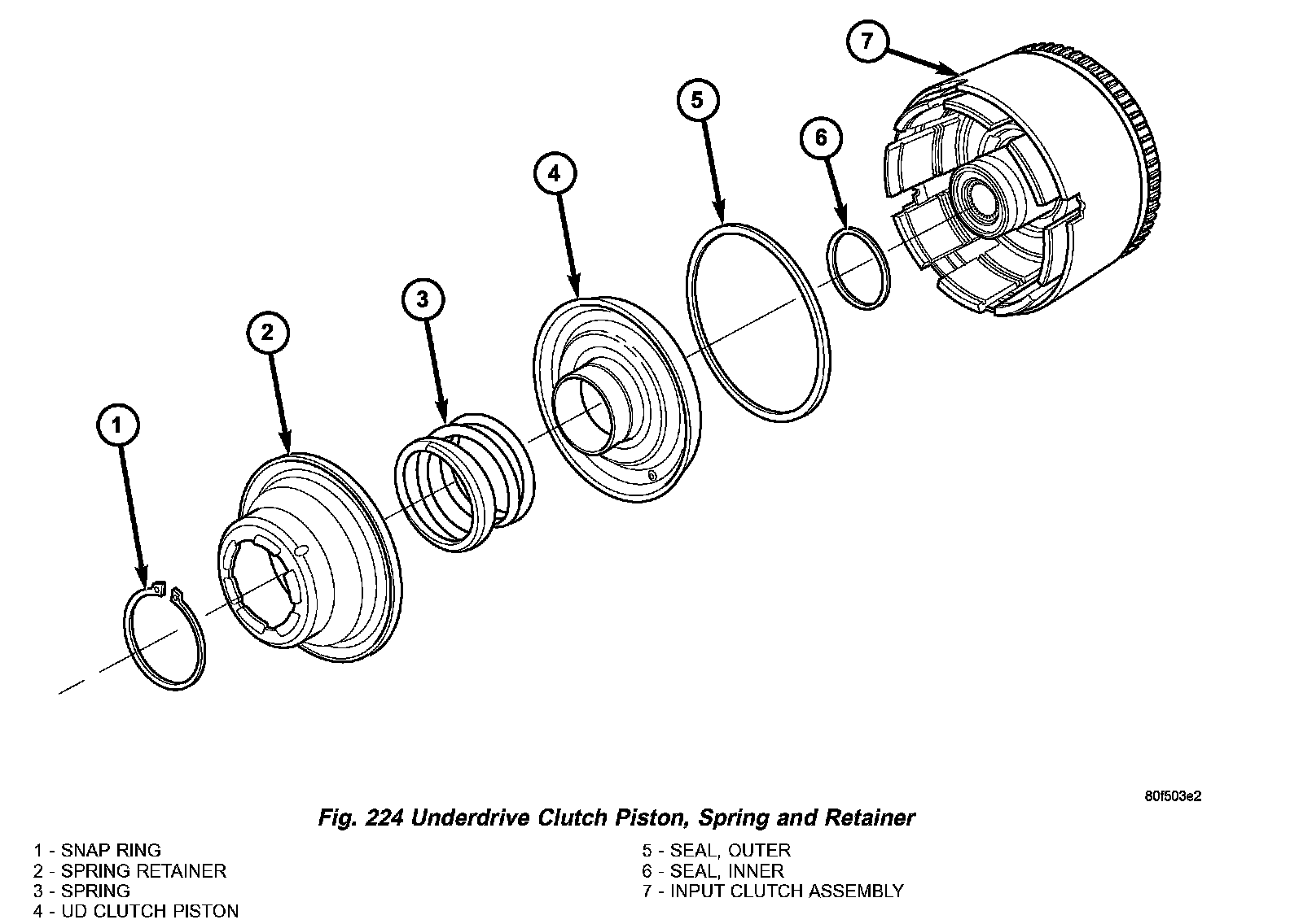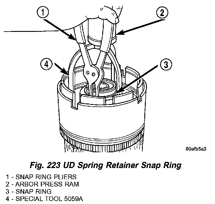 13. Using Tool 5059A and an arbor press, compress UD clutch piston/spring enough to remove snap ring (Fig. 223) (Fig. 224).