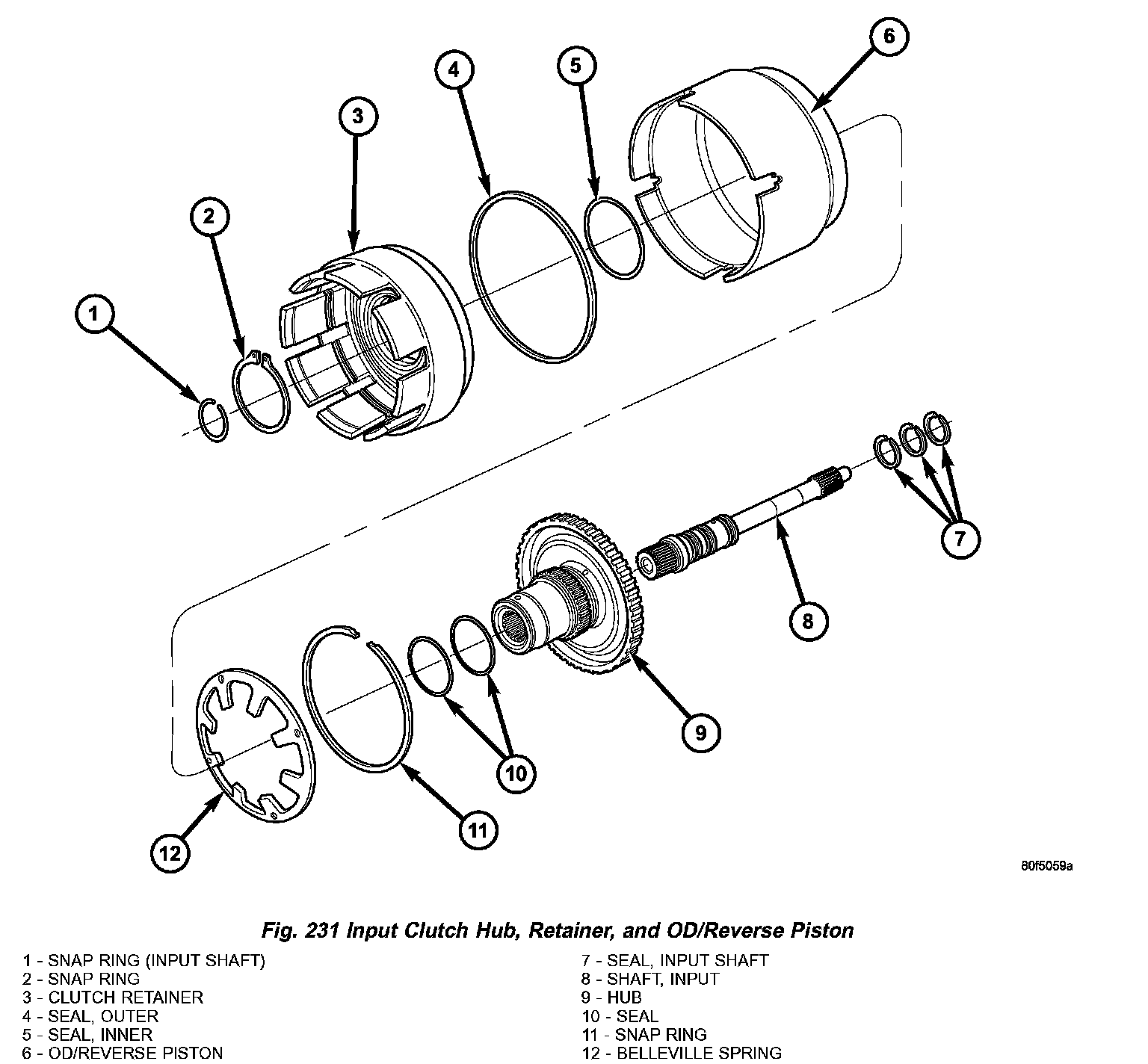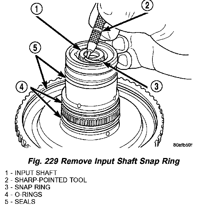 19. Remove input shaft to input clutch hub snap ring (Fig. 229) (Fig. 231).