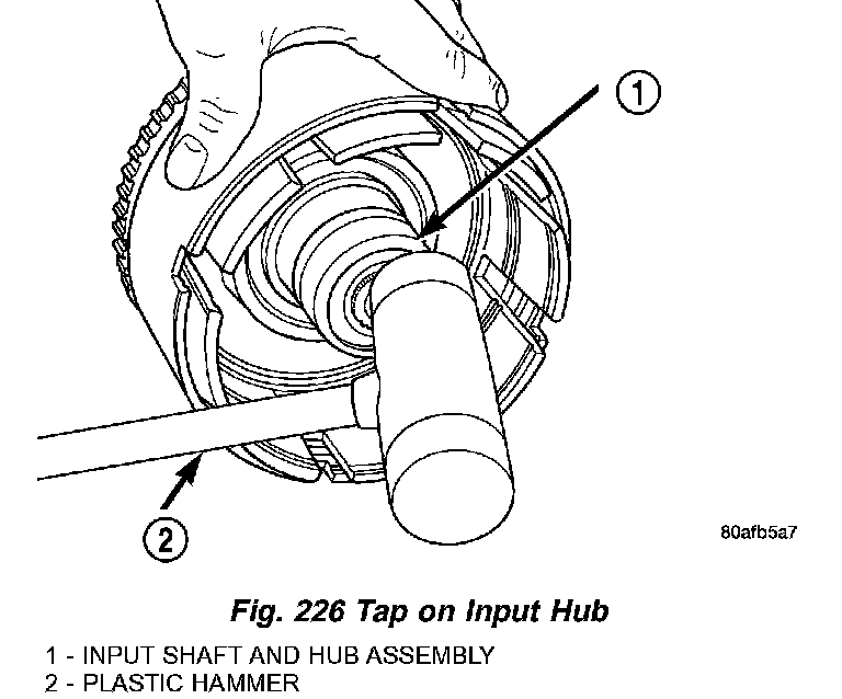 16. Tap on input hub with soft faced hammer and separate input hub from OD/Reverse piston and clutch retainer (Fig. 226).