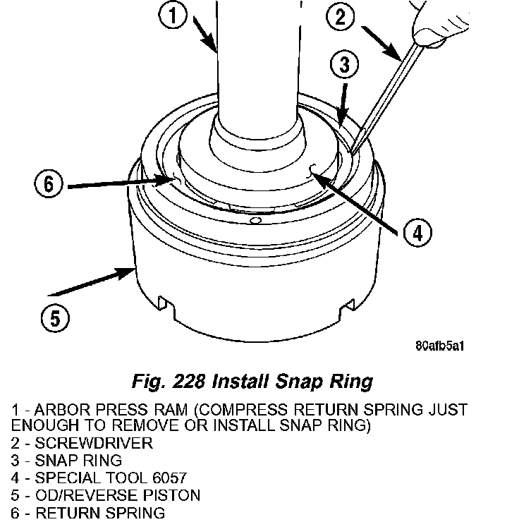 18. Using Tool 6057 and an arbor press, compress return OD/Reverse piston return spring just enough to remove snap ring (Fig. 228).