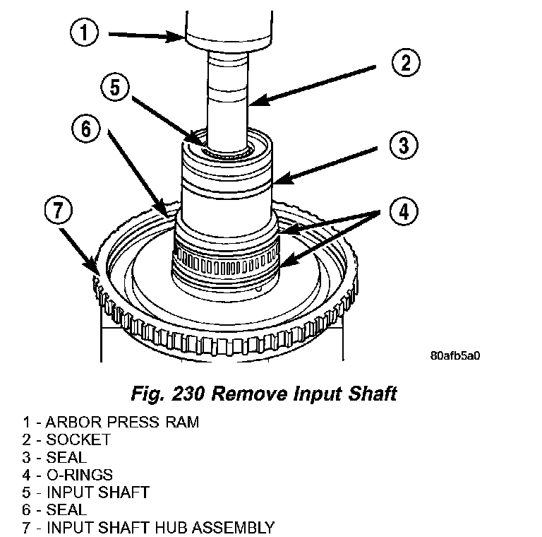20. Using a suitably sized socket and an arbor press, remove input shaft from input shaft hub (Fig. 230).