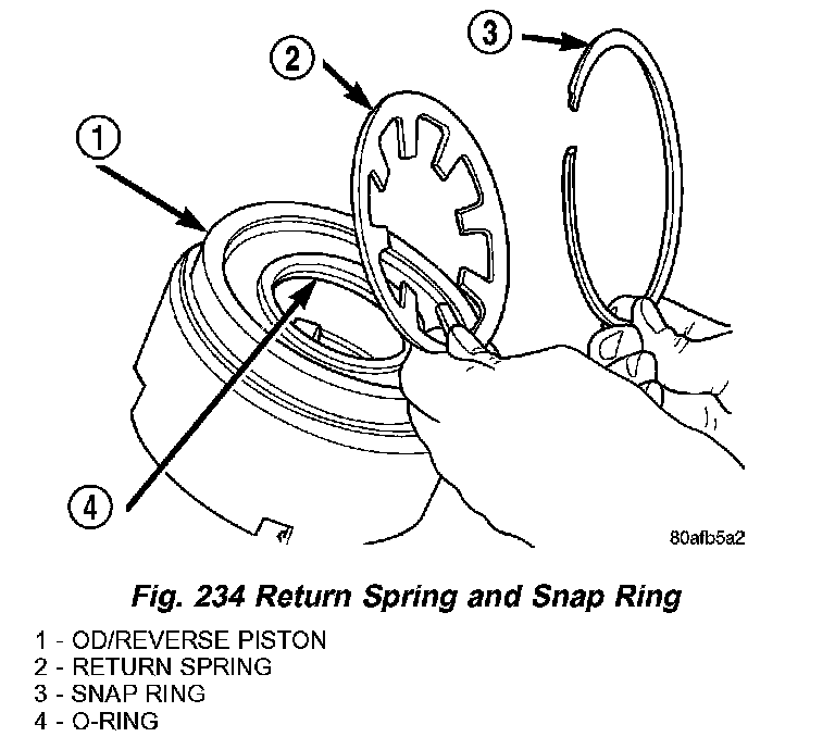 3. Using an arbor press and Tool 6057, Install OD/Reverse piston return spring and snap ring (Fig. 234) (Fig. 235).