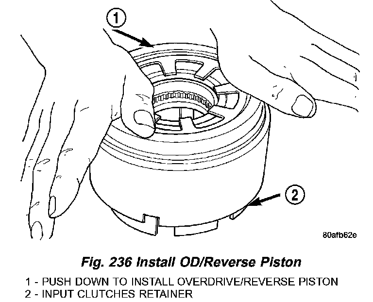 4. Install the OD/Reverse piston assembly to the input clutch retainer as shown in (Fig. 236).