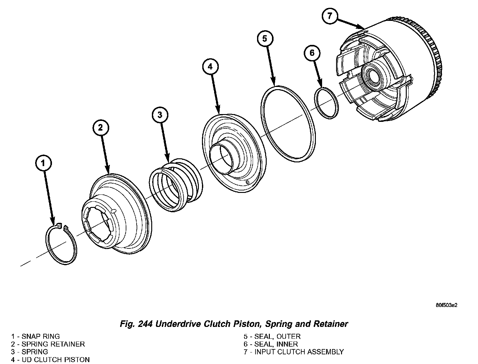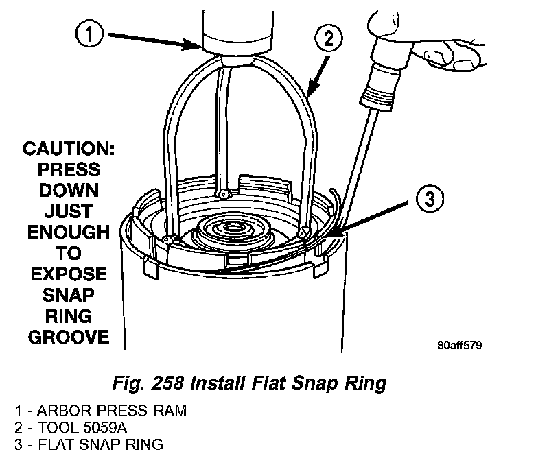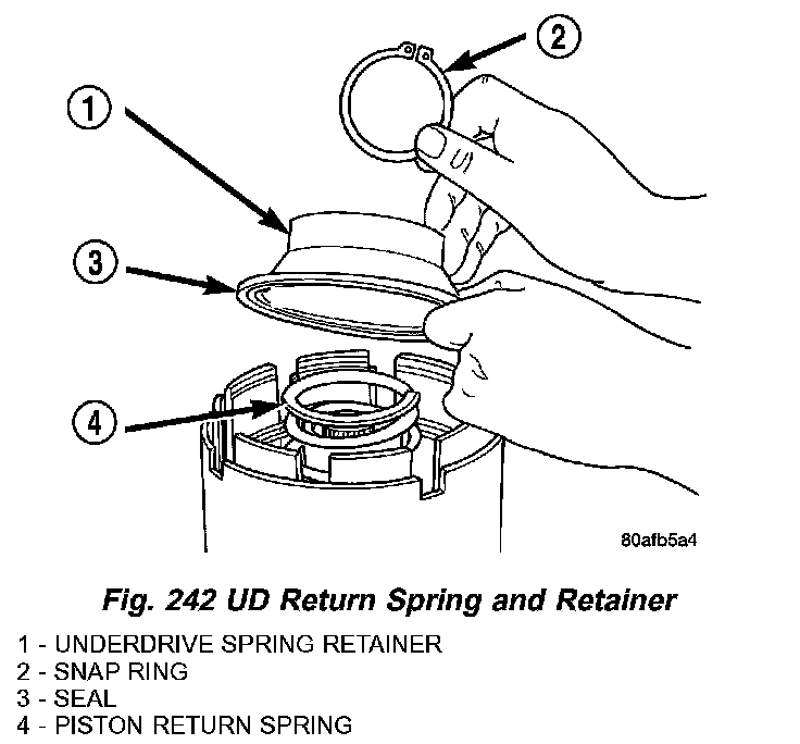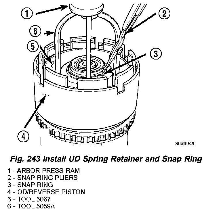 9. Using Tool 5059A and an arbor press, Install the UD spring retainer and snap ring (Fig. 242) (Fig. 243) (Fig. 244) Compress just enough to install snap ring.