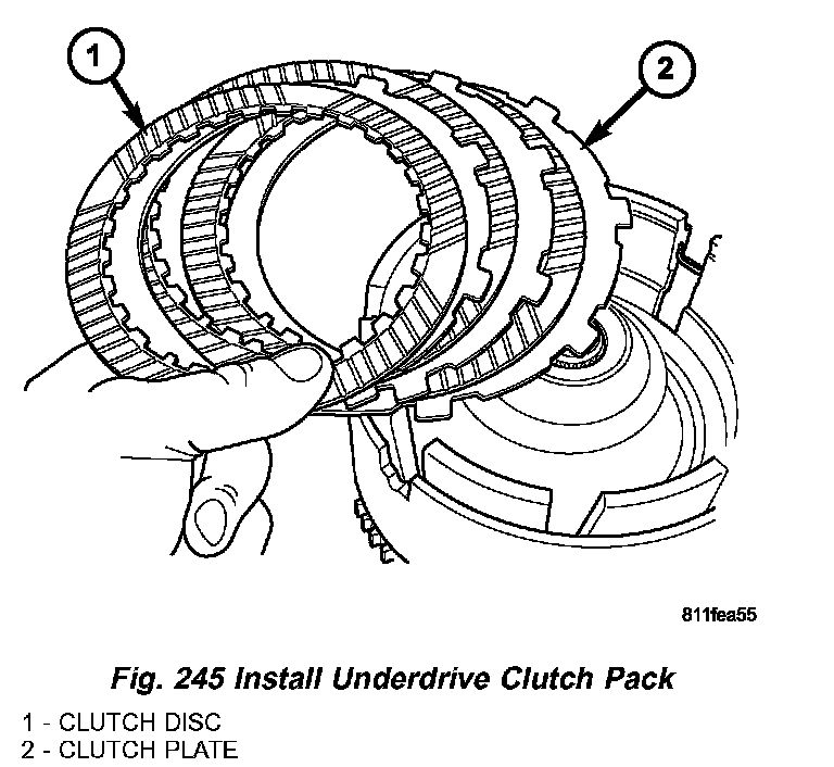 10. Install the UD clutch pack. Leave out upper disc, until snap ring is installed (Fig. 245).