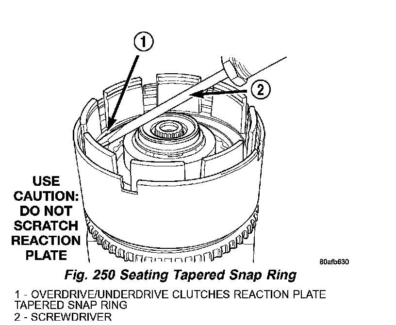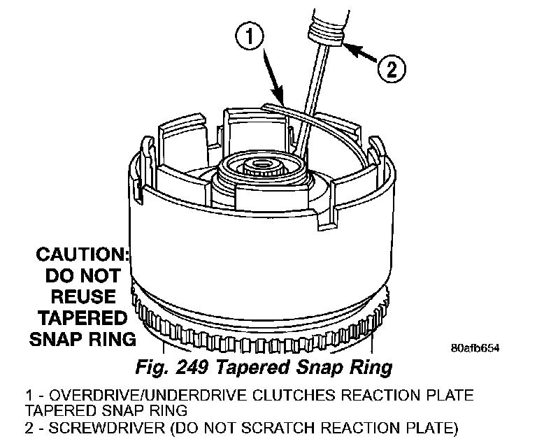 13. Install the OD/UD clutch reaction plate and snap ring (Fig. 248) (Fig. 249). The OD/UD clutches reaction plate has a step on both sides. Install the OD/UD clutches reaction plate tapered step side up.