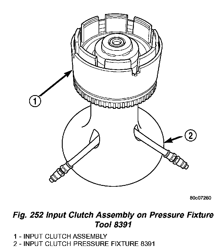15. Install input clutch assembly to the Input Clutch Pressure Fixture-Tool 8391 (Fig. 252).