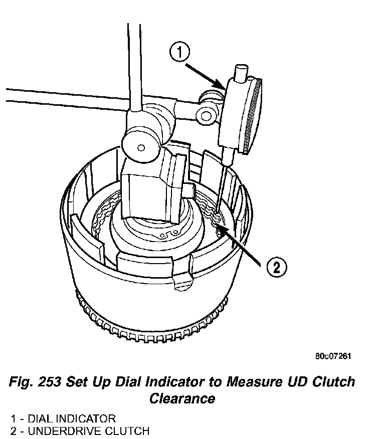 16. Set up dial indicator on the UD clutch pack as shown in (Fig. 253).