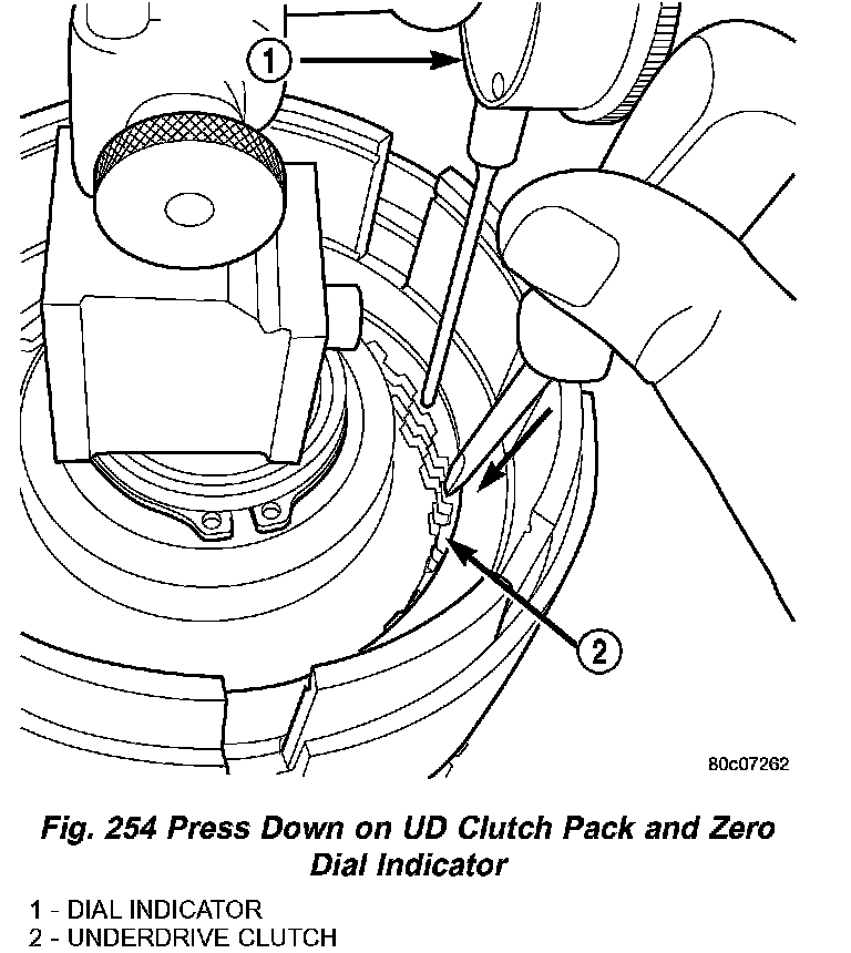 17. Using moderate pressure, press down and hold (near indicator) the UD clutch pack with screwdriver or suitable tool and zero dial indicator (Fig. 254). When releasing pressure on clutch pack, indicator reading should advance 0.005 - 0.010.