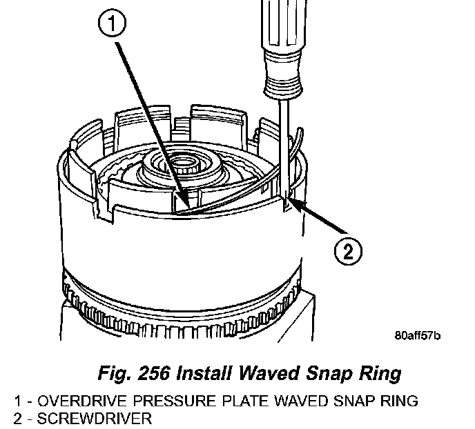 22. Install OD pressure plate waved snap ring (Fig. 256).
