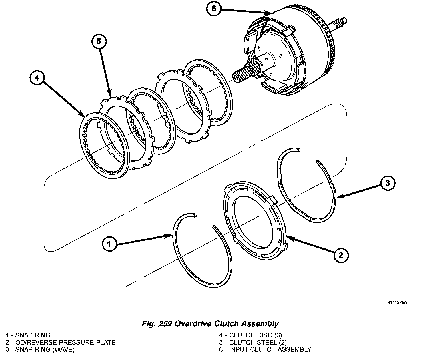 24. Install OD pressure plate flat snap ring (Fig. 258) (Fig. 259).