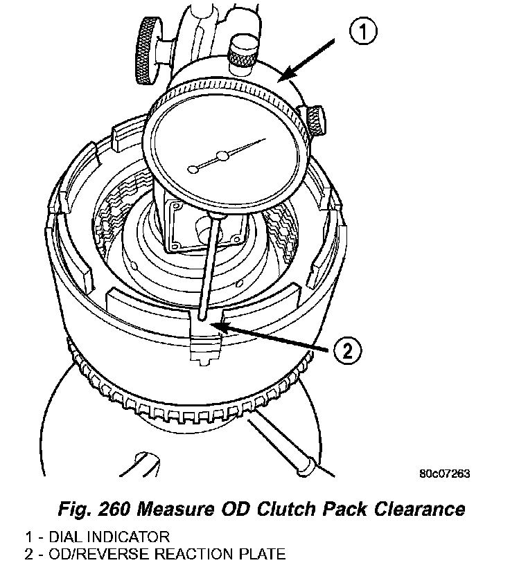 25. Measure OD clutch pack clearance. Set up dial indicator on top of the OD/Reverse pressure plate as shown in (Fig. 260).