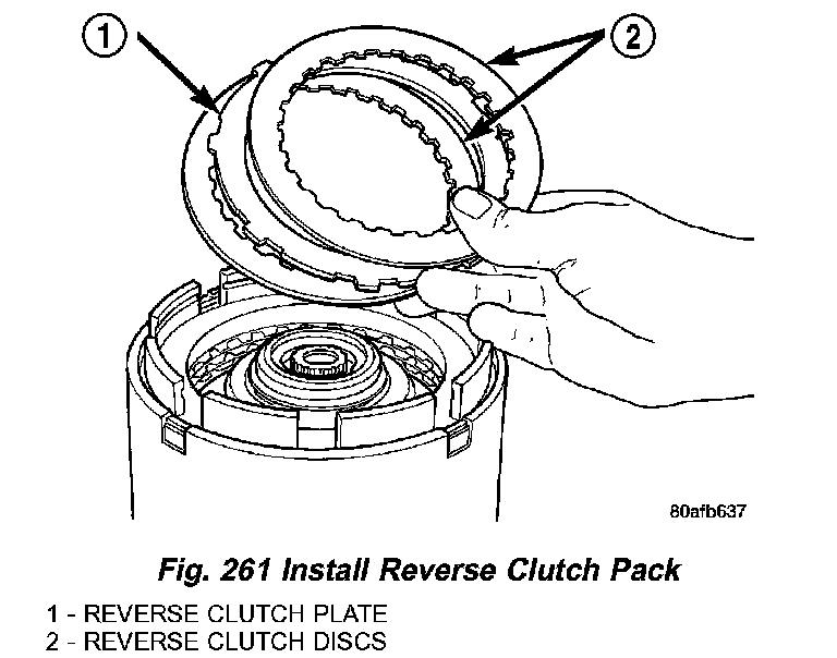 28. Install reverse clutch pack (two frictions/one steel) (Fig. 261).