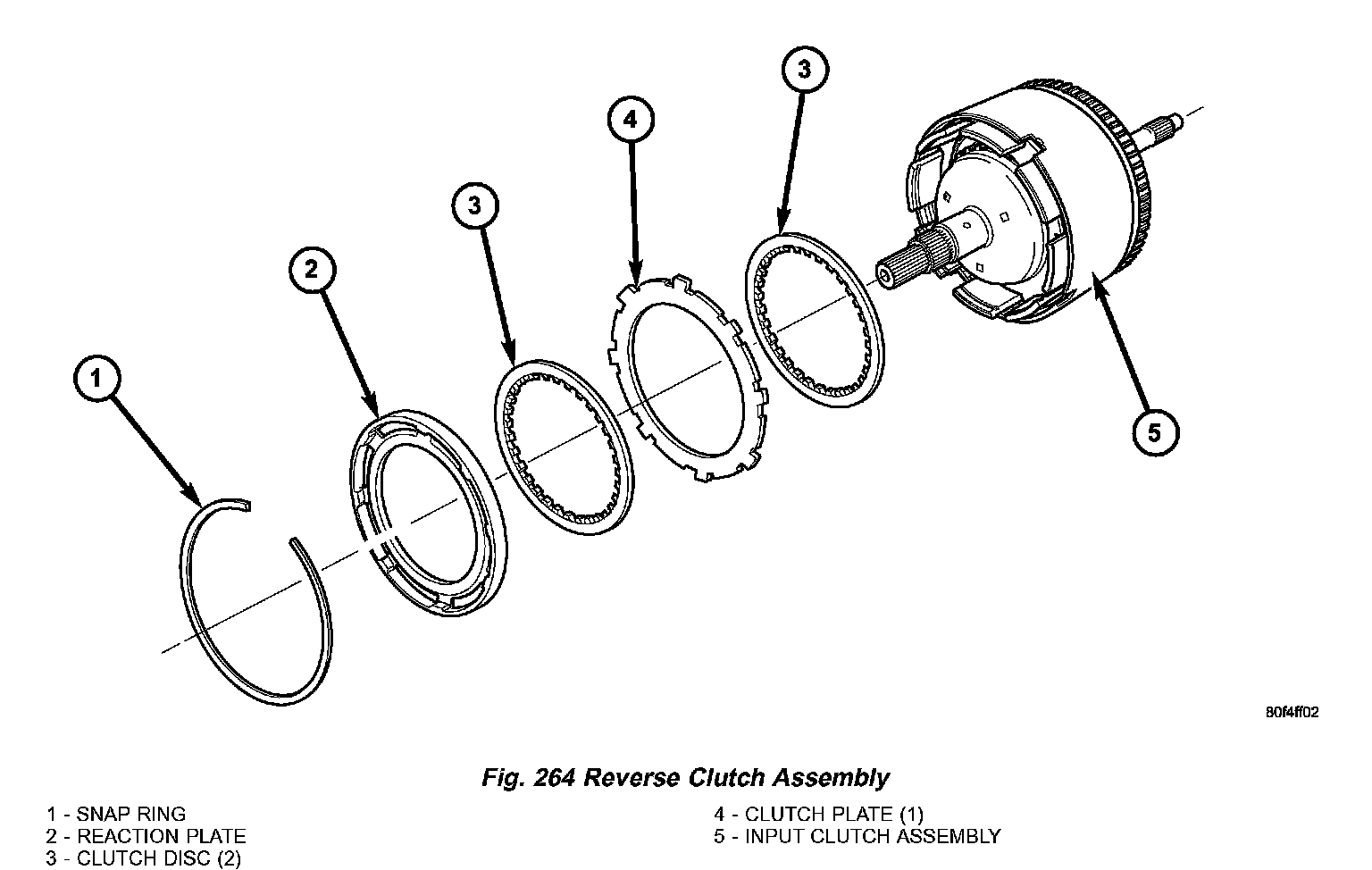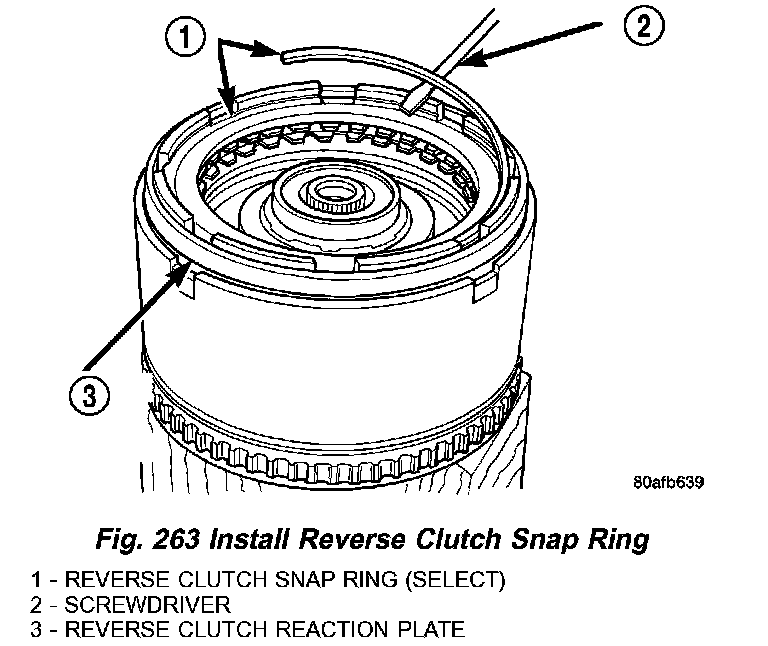 30. Tap reaction plate down to allow installation of the reverse clutch snap ring. Install reverse clutch snap ring (Fig. 263) (Fig. 264).
