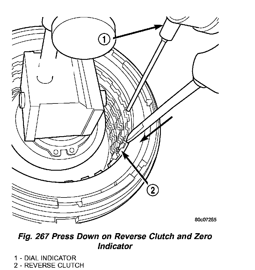 32. Set up a dial indicator on the reverse clutch pack as shown in (Fig. 266).