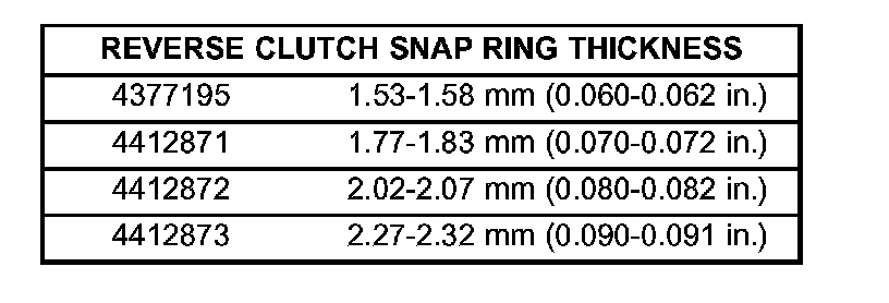 35. Take average of four measurements and compare with reverse clutch pack clearance specification. The reverse clutch pack clearance is 0.89 - 1.37 mm (0.035 - 0.054 inch). Select the proper reverse clutch snap ring to achieve specifications: