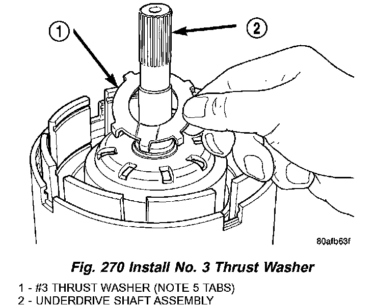 39. Install the #3 thrust washer to the underdrive shaft assembly. Be sure five tabs are seated properly (Fig. 270).