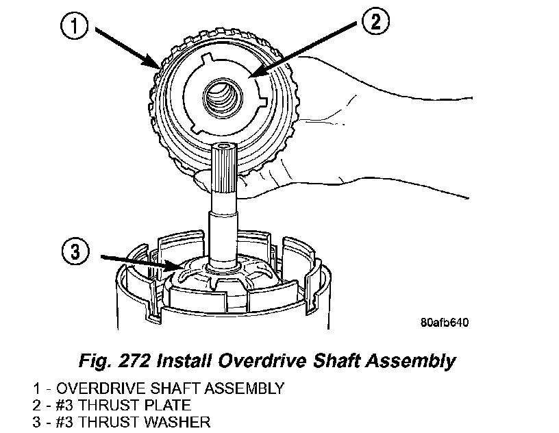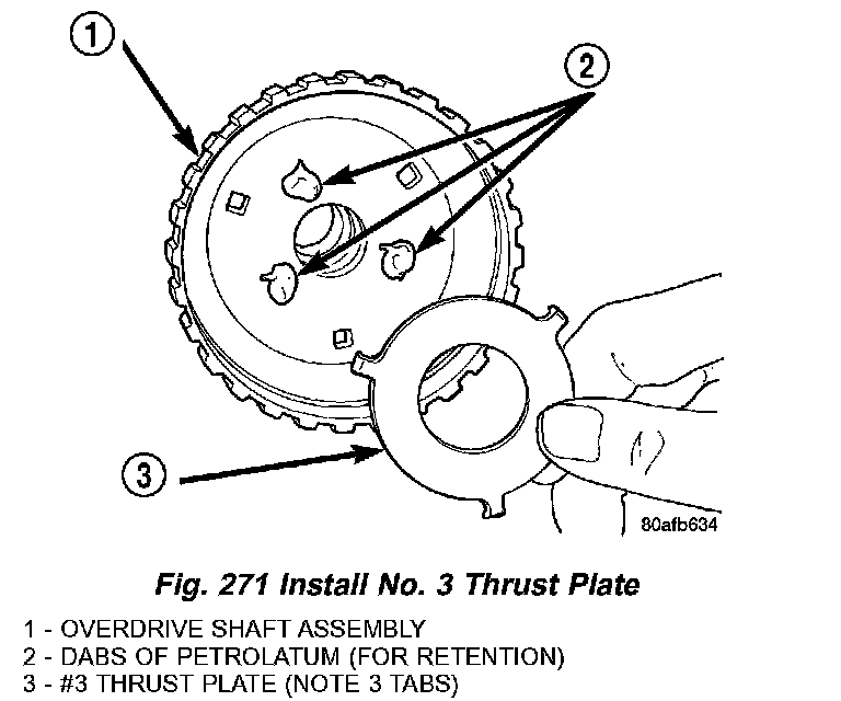 40. Install the #3 thrust plate to the bottom of the overdrive shaft assembly Retain with petrolatum or transmission assembly gel (Fig. 271).